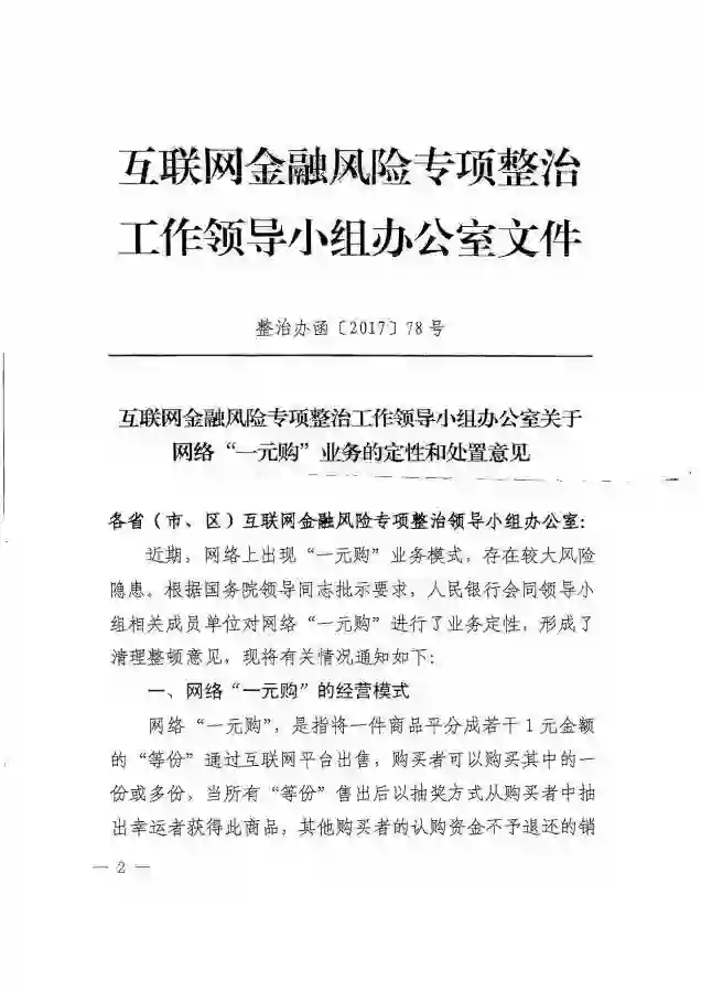 7 月中旬,国家互联网金融风险专项整治领导小组办公室发布《关于网络“一元购”业务的定性和处置意见》,明确将网络“一元购”定性为变相赌博或者诈骗,并将对其展开新一轮整顿清理工作。对于利用“一元购”从事赌博活动或涉嫌诈骗的违规行为,依法予以打击处理。