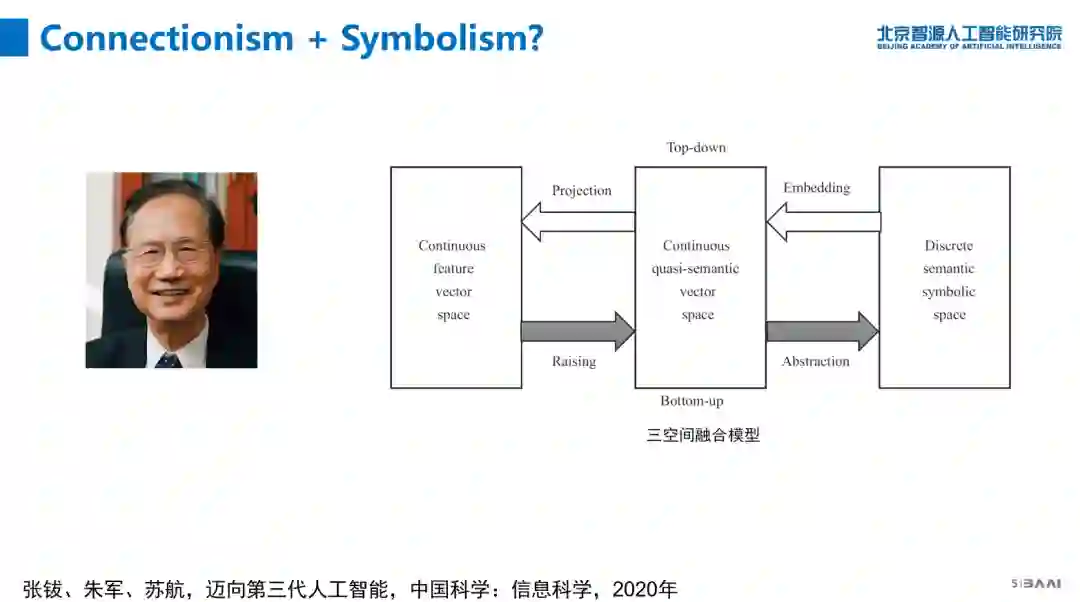 首先,连接主义和符号主义的结合。前两波人工智能热潮分别由符号主义和连接主义主导,现在把它融合在一块是最直接的想法,有代表性的像张院士、周志华等是这么认为的;国外也有很多专家这么认为的。但怎么走,没有定论。