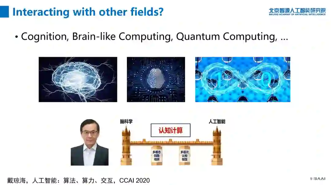 很多同事认为AI跟cognition要关联,这个问题不大,戴院士在中国人工智能大会上说他要对人脑进行全面建模,甚至进行扫描,有点接近黄铁军教授的还原主义的思想,但是他中间多加了两个桥梁,这样方便通过一步步过去。