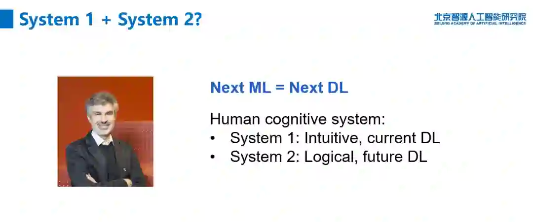 在林宙辰教授的报告中指出,当前深度学习红利已经接近终点,下一代机器学习会是什么成为亟待思考的问题。目前有不同方案,例如张钹院士等人提出的“认知+符号”,Y.Bengio 等人提出的“System 1+System 2”,M. Jordan 则认为根本不需要新的算法,只要有市场推动即可。目前为止,这仍然是一个开放问题。