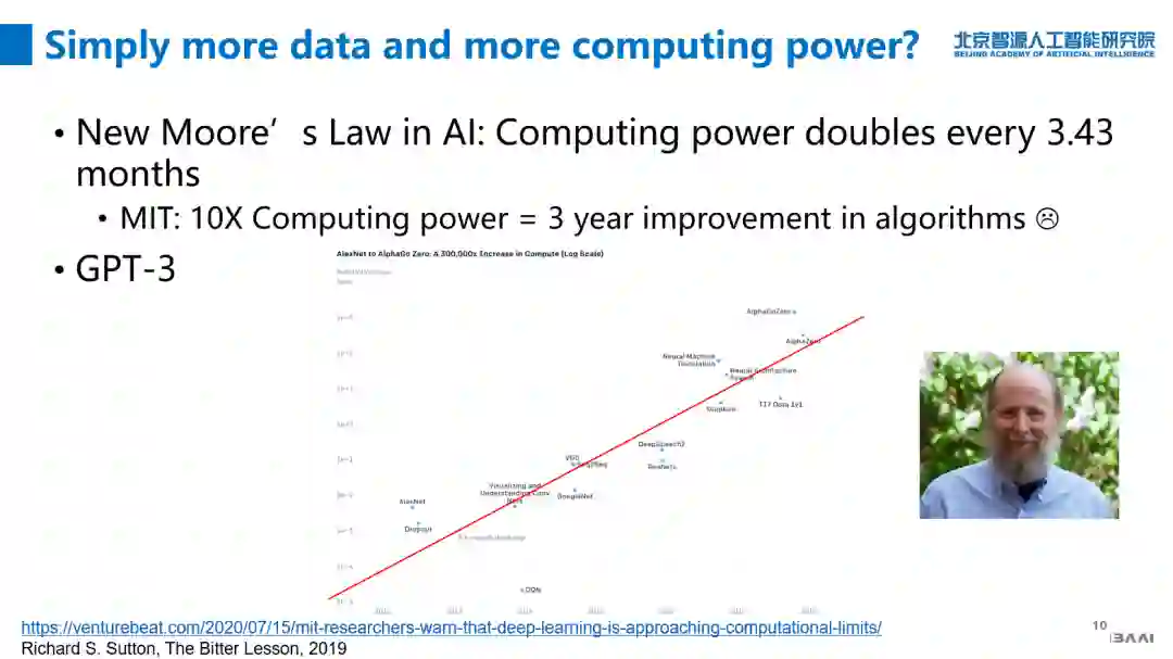 强化学习的鼻祖 Richard S. Sutton 在去年写了一个博客,对人工智能近70年进展感到非常悲观,他说这些进展都是算力引起的,不要以为算法在AI里面会起什么关键作用;人的算法在里面可能会起一定作用,但是并没有直接提升算力作用这么明显。今年GPT-3横空出世,直接把参数上升100倍,性能上马上有了质的变化,这好像也迎合了这个思潮,因此,是不是单纯堆算力和数据就能解决问题?