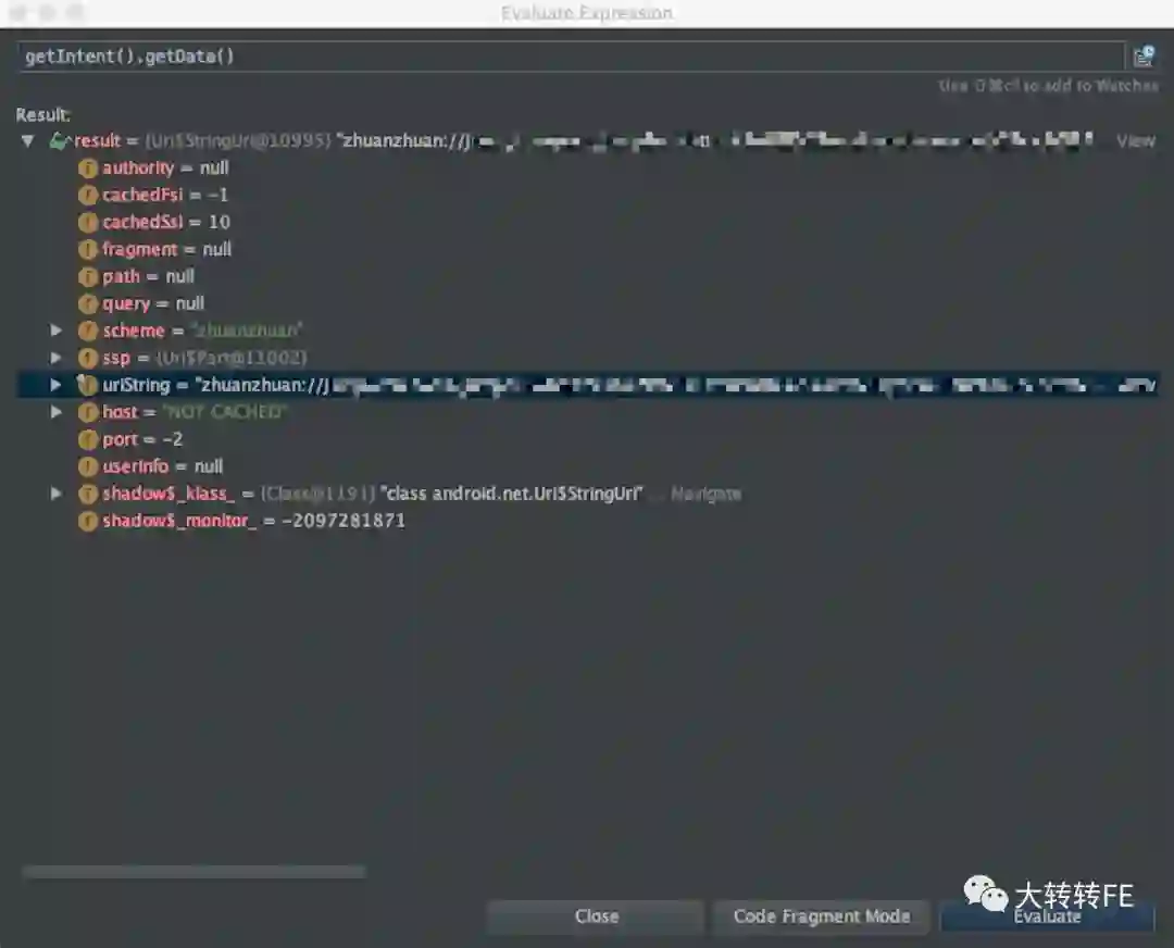例如上面的代码,可以在此Activity中,通过 intent 中的 getData 方法,获取到传入的schema的相关信息,如下图: