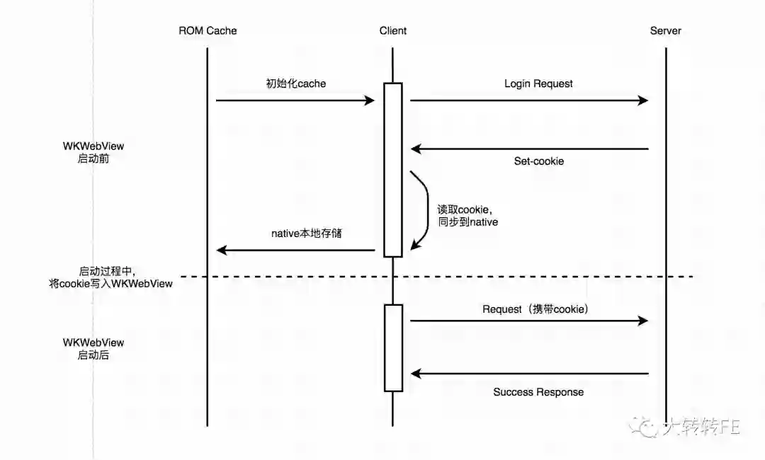 针对这个问题,目前我们转转的解决方法是需要客户端手动干预一下cookie的存储。将服务响应的cookie,持久化到本地,在下次webview启动时,读取本地的cookie值,手动再去通过native往webview写入。大致流程如下图: