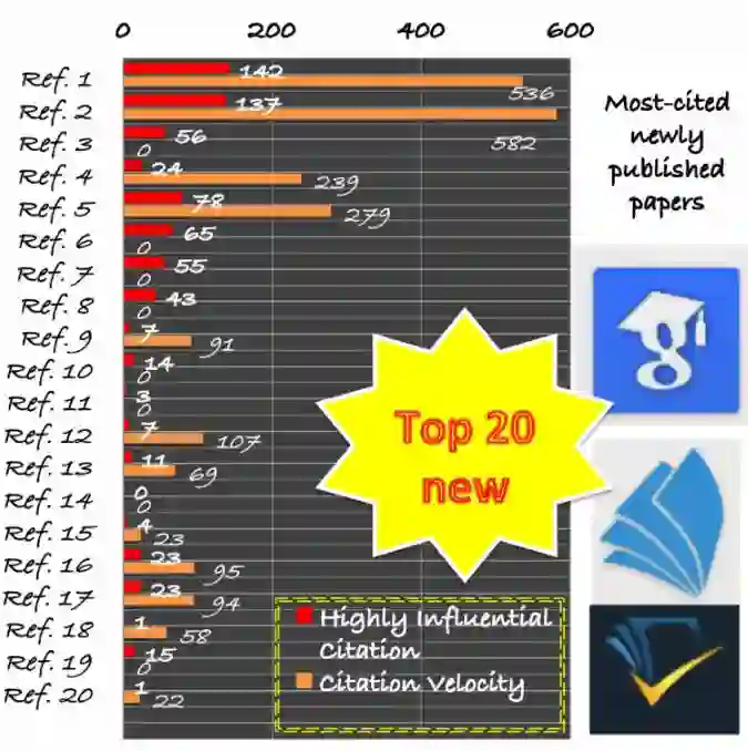 我们筛选论文的标准是来自三大学术搜索引擎谷歌学术(scholar.google.com)、微软学术(academic.microsoft.com)和 semanticscholar.org 的引用量。由于不同搜索引擎的引用量数据各不相同,所以我们在这里仅列出了微软学术的数据,其数据比其它两家稍低一点。