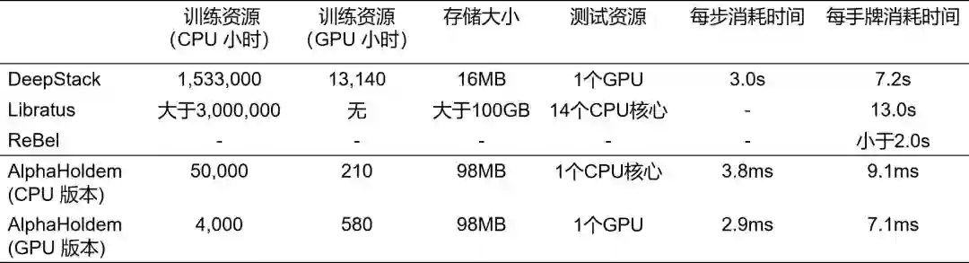 我们将AlphaHoldem与当前的高水平德扑AI进行了比较,发现AlphaHoldem都有明显优势。经过10万局的对抗,AlphaHoldem平均赢Slumbot[7](2018年世界计算机扑克大赛ACPC冠军,现在还在进化)111.56 mbb/局(每1000手牌赢多少个大盲注),赢DeepStack(课题组使用120 GPU卡训练3周复现的版本)16.91 mbb/局。同时,它可以达到人类专业玩家水平,通过和4位专业玩家对抗1万局,AlphaHoldem平均赢专业玩家10.27 mbb/局。另外,AlphaHoldem在一台包含1个AMD 2.00GHz CPU(64个核心)、8个NVIDIA TITAN V GPU的服务器上仅训练三天,在一个CPU核心下每次决策仅需4毫秒,做到了真正的又快又好。