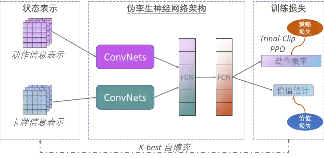 不同于已有的基于CFR算法的德州扑克AI,中国科学院自动化研究所博弈学习研究组基于端到端的深度强化学习算法研发了一款高水平轻量型的德州扑克AI程序AlphaHoldem,其整体架构如图4所示。AlphaHoldem采用Actor-Critic学习框架[8],其输入是卡牌和动作的编码,然后通过伪孪生卷积网络(结构相同参数不共享)提取特征,接下来通过两个全连接层得到状态的高层特征,最终输出动作概率和价值估计。AlphaHoldem的成功得益于其采用了一种高效的状态编码来完整地描述当前及历史状态信息、一种基于Trinal-Clip PPO损失的深度强化学习算法来大幅提高训练过程的稳定性和收敛速度、以及一种新型的Best-K自博弈方式来有效地缓解德扑博弈中存在的策略克制问题。