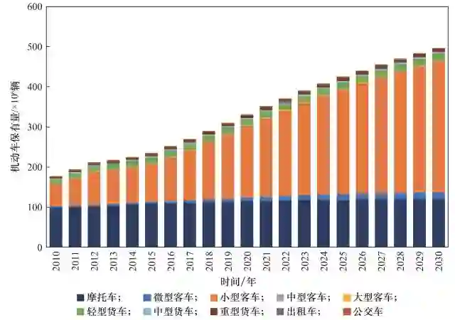 本研究根据不同车型的发展趋势,结合各类车型的保有量历史变化特征和未来的社会、经济发展趋势,对城市机动车的保有量发展规律进行了建模,并在此基础上对 2030 年前的保有量进行了预测。图 6 展示了我国机动车保有量未来趋势预测结果。预测结果显示,到 2030 年我国将拥有汽车 3.9 亿辆,即每千人的汽车拥有量接近 280 辆,而机动车总量将达到 4.9 亿辆。