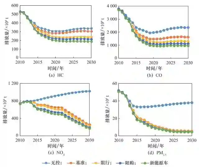 图 9 展示了我国机动车在不同排放控制情境下的各污染物(HC、CO、NOX 和 PM 2.5)排放趋势预测。