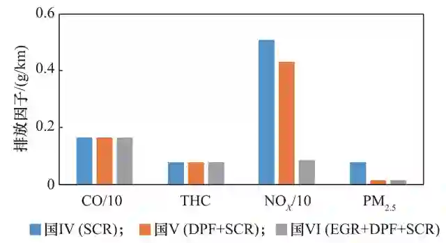 综上所述,重型车未来主要技术路线的排放因子如图 8 所示。根据欧洲的技术经验,本研究中假设国 VI 重型车将在国 V 标准基础上进一步对 NOX 和 PM 2.5 排放水平加严 30%。