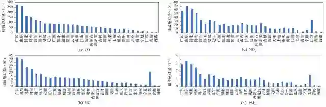 2013 年全国道路机动车共排放污染物总量为碳氢化合物(HC)4.16×10^6 t、一氧化碳(CO)2.742×10^7 t、氮氧化物(NOX)7.72×10^6 t,细颗粒物(PM 2.5)3.7×10^5 t。我国部分省市汽车污染物排放绝对量情况如图 1 所示 [4]。对于 4 种污染物的排放绝对量而言,普遍较高的省份为:广东、山东、河北、河南和江苏。不论人口、经济总量还是地域面积,这几个省份均排在前列,因而汽车总保有量较高。此外,部分省份(如河北和河南)汽车排放控制水平相对落后也是造成排放总量较高的原因之一。