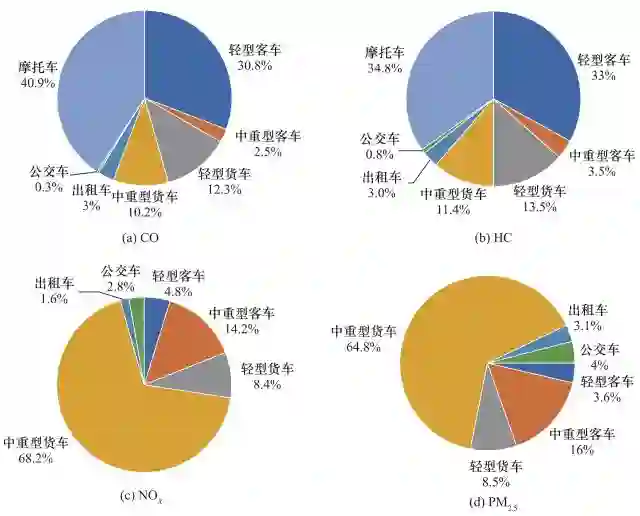 不同车型的污染物排放分担率如图 2 所示。从贡献的车型上看,小型客车是最重要的 HC 和 CO 排放源,中重型货车是最主要的 NOX 和 PM 2.5 的排放源。