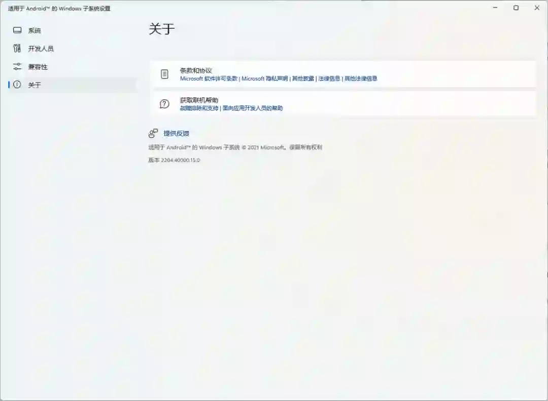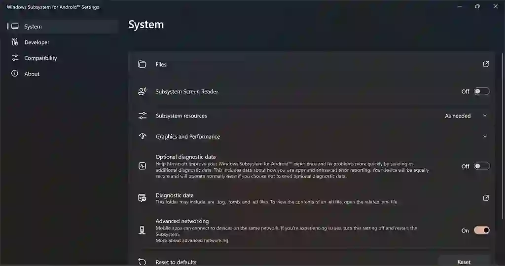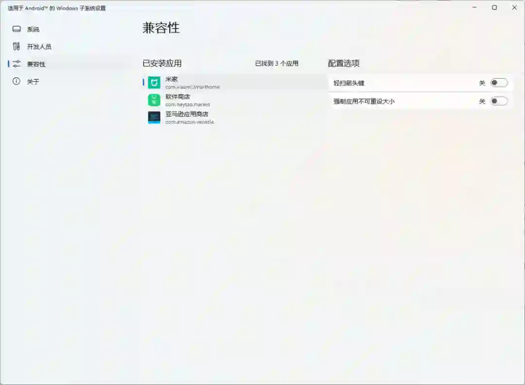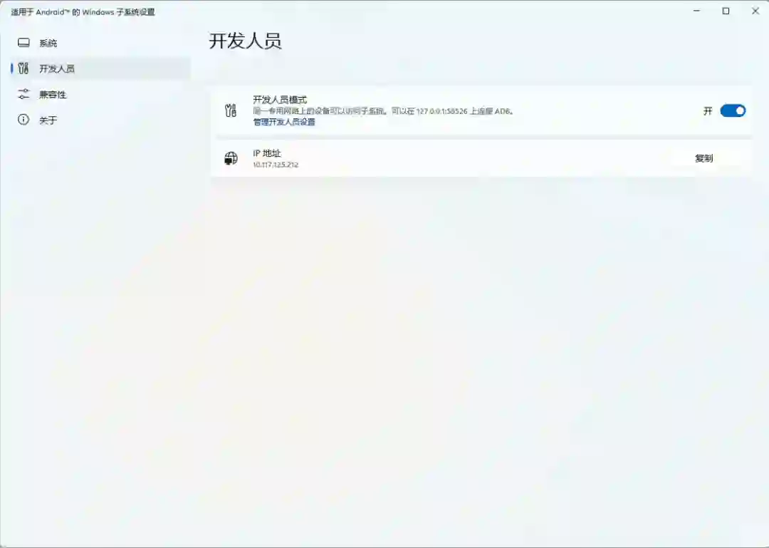 此前「开发人员模式」被正式移动到了独立的分组「开发人员」中,通过这个入口我们可以启动 WSA 的开发者模式,并使用 ADB 命令来手动安装应用;新的组中「兼容性」则可以对每一个安装的应用进行配置,比如说我们现在可以强制应用不可重设大小,以及轻扫箭头键等;此外,新版设置门户还增加了「可选诊断数据」和「高级网络」设置项——由于 WSA 是基于 Windows Subsystem for Linux 2 发展而来,因此一直以来WSA 都和 Windows 主系统不在一个网段中,这使得我们通过网络上访问子系统非常麻烦。