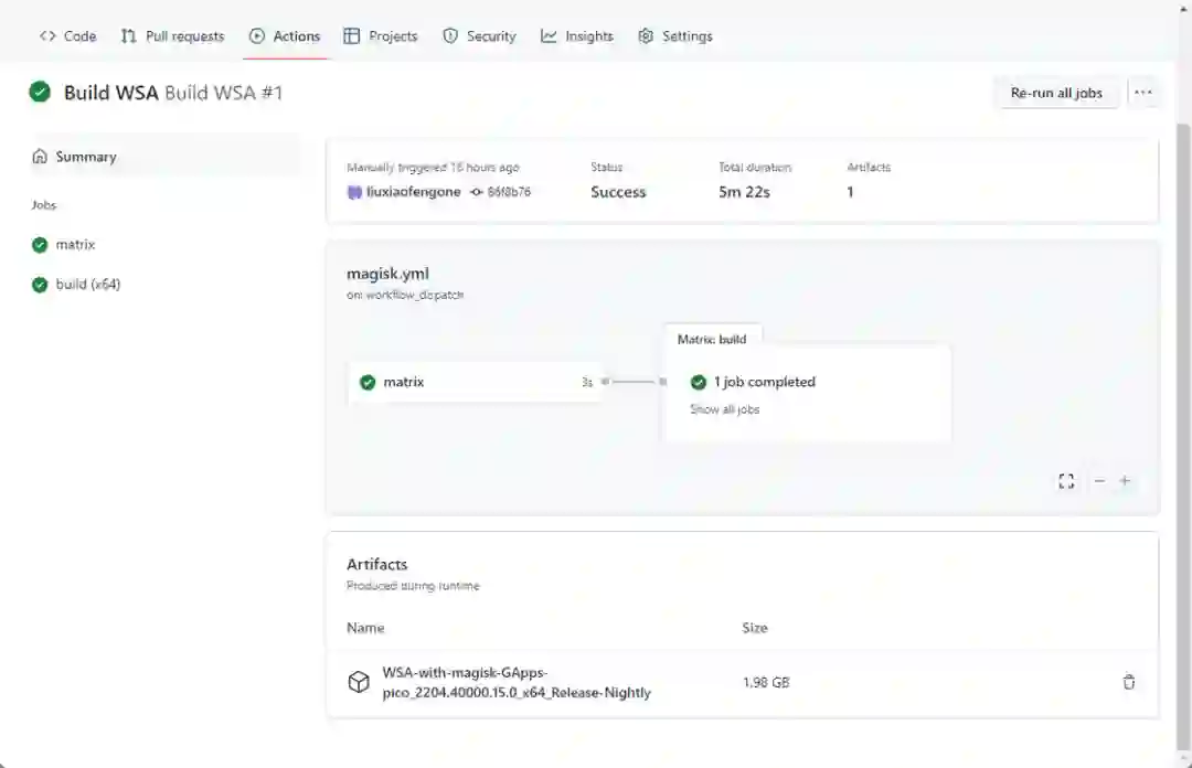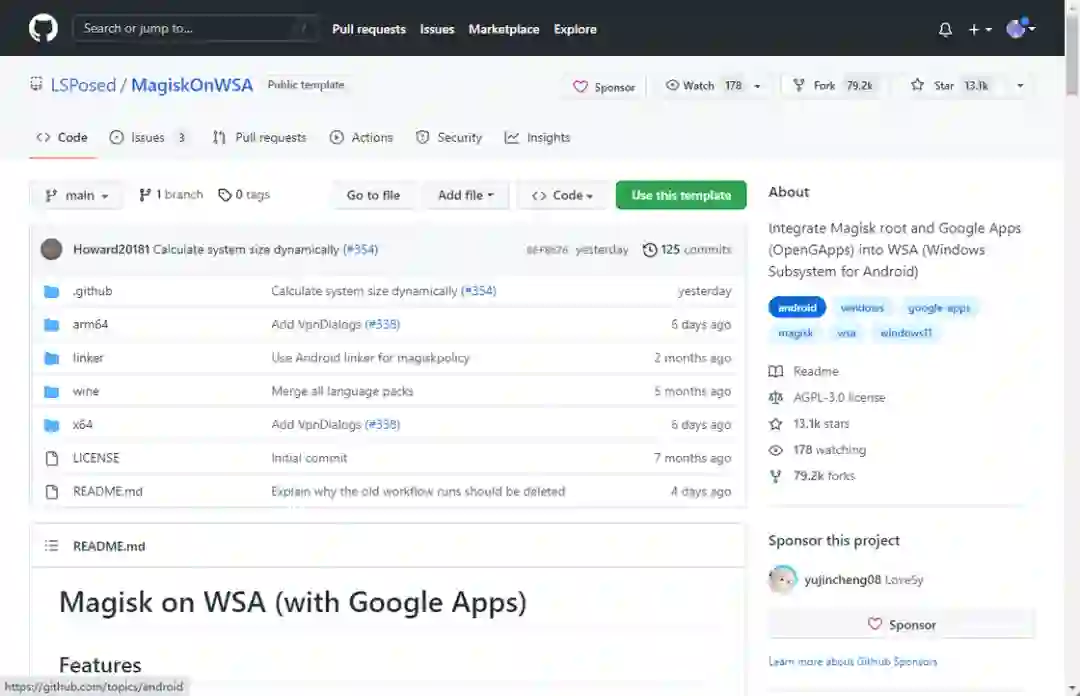 这里介绍通过 LSPosed 的 MagiskOnWSA 项目的实现方案。简单来说,这种方法主要通过修改 WSA 的安装包并嵌入 GMS 和 Magisk、然后再重新安装的方式,来实现对 WSA 的修改和定制。