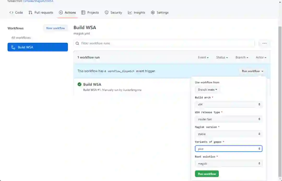 在 fork 而来的 Magisk on WSA 项目中,点击 Actions(如果是首次点击创建工作流),找到 Build WSA 并在