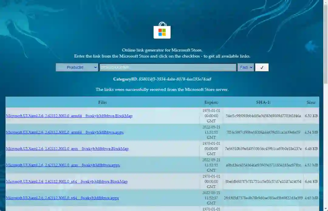 这里我们依旧是通过 store.rg-adguard.net 来下载离线安装包,打开网站后,首先选择 ProductID,然后在数据框中输入包名 9P3395VX91NR,最右侧的通道选择 Fast,搜索后找到最下面的名为 MicrosoftCorporationII.WindowsSubsystemForAndroid_2204.40000.15.0_neutral_~_8wekyb3d8bbwe.msixbundle 的包然后点击下载。