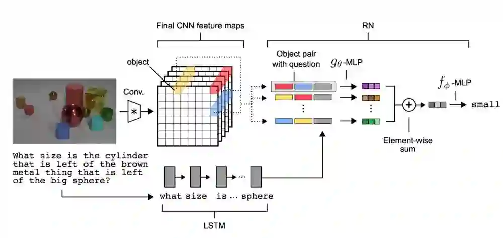 作者们将关系神经网络视为一个模块,它可以学习标记对象之间的关系,更重要的是,他们可以被放到卷积神经网络 (CNN) 和长短期记忆 (LSTM) 中。