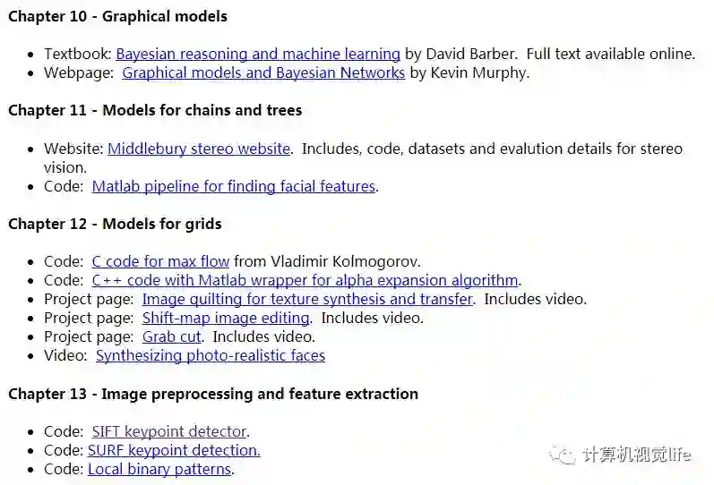 该书从基础的概率模型讲起,涵盖了计算机视觉领域常用的概率模型、回归分类模型、图模型、优化方法等,以及偏底层的图像处理、多视角几何知识,图文并茂,并辅以非常多的例子和应用,非常适合入门。在其主页: