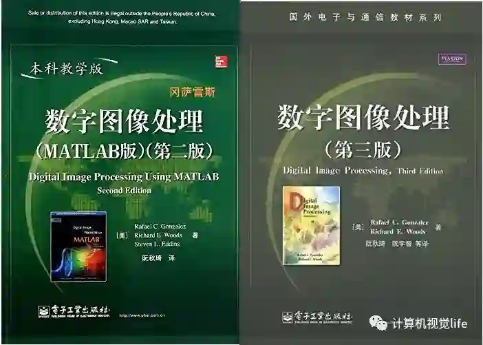 推荐使用冈萨雷斯的《数字图像处理(MATLAB版)》(英文原版2001年出版,中译版2005年)。不需要一上来就全部过一遍,只需要结合MATLAB学习一下基本原理、图像变换、形态学处理、图像分割,以上章节强烈建议按照书上手动敲一遍代码(和看一遍的效果完全不同),其他章节可快速扫描一遍即可。但这本书比较注重实践,对理论的解释不多,理论部分不明白的可以在配套的冈萨雷斯的《数字图像处理(第二版)》这本书里查找,这本书主要是作为工具书使用,以后遇到相关术语知道去哪里查就好。