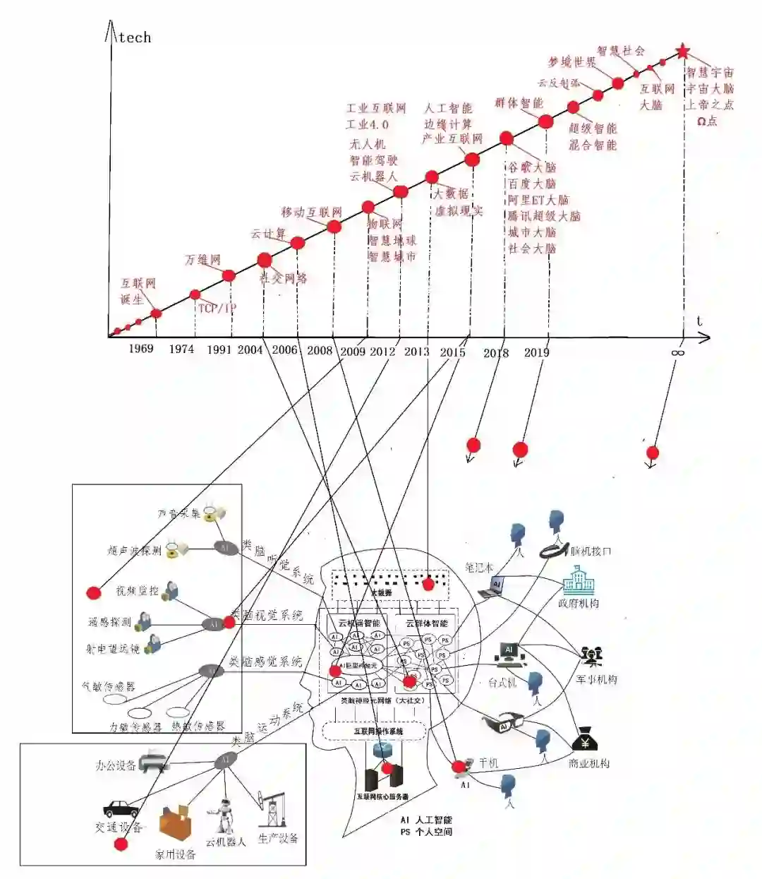 经过50年的发展,特别是在21世纪,数十亿人类群体智慧与数百亿设备的机器智能通过互联网大脑结构联合形成自然界前所未有的智能形式,也就是一种新超级智能的形成。