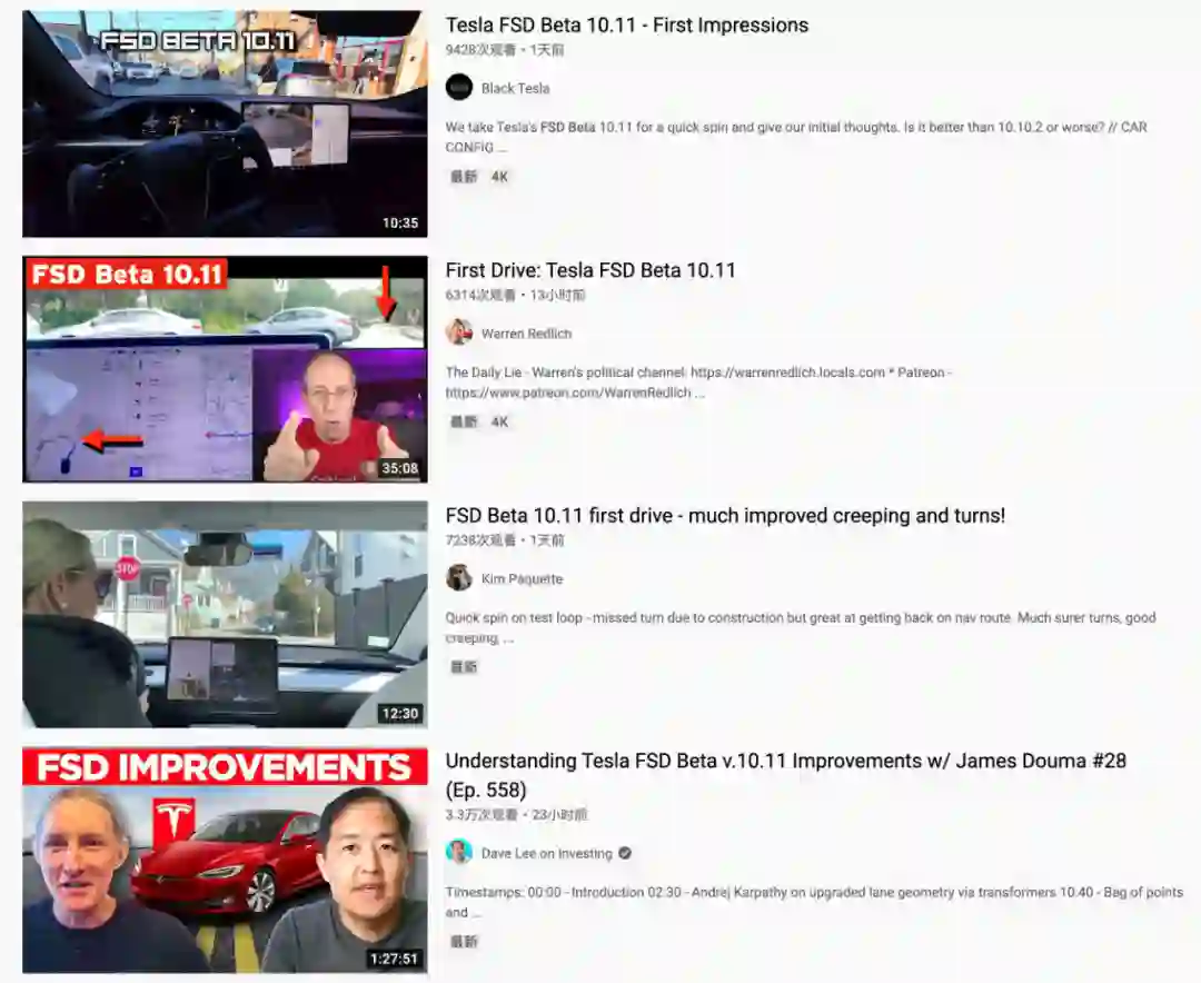 事实的确如此,许多 FSD Beta 测试人员都在 YouTube 上发布了对 FSD Beta 的评论,各种测评栏目层出不穷: