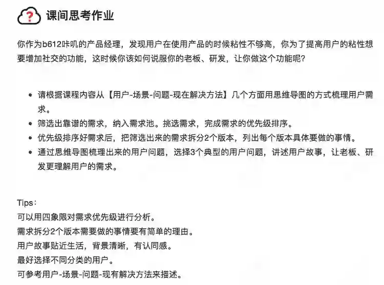 我们在课程中的每个章节下,都设置了相应的实战训练作业,这些作业均来自一线互联网公司的真实案例,会在最大程度上与真实工作场景相切合,希望能借此帮大家更好的掌握产品人的诸多能力。在这里,不妨直接拿出产品P2课程“需求分析”这一章节的作业,供大家参考——