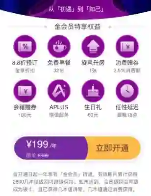 此外,还可以参考亚朵酒店的做法,将等级会员的某一级作为付费对象来售卖,如下图,亚朵酒店将会员体系中的第三级【金会员】单独售卖。
