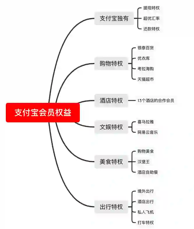 从核心权益角度看:支付宝会员体系的权益覆盖用户的衣食住行多种场景,核心特权是在支付宝内的商家小程序可以享受会员特权。满足了用户在支付宝以会员身份完成衣食住行的需求。