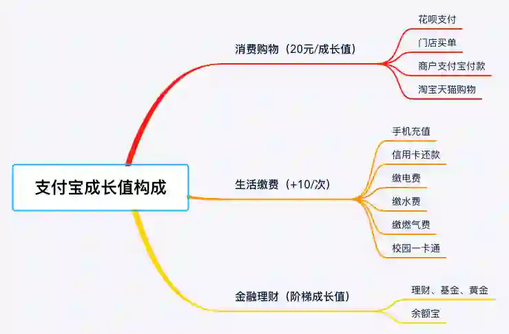 支付宝主要的运营动作包括促进用户消费购物、完成生活缴费和增加金融理财。生活缴费任务的成长值奖励较高,可以推测占据用户生活支付场景是主要运营方向。