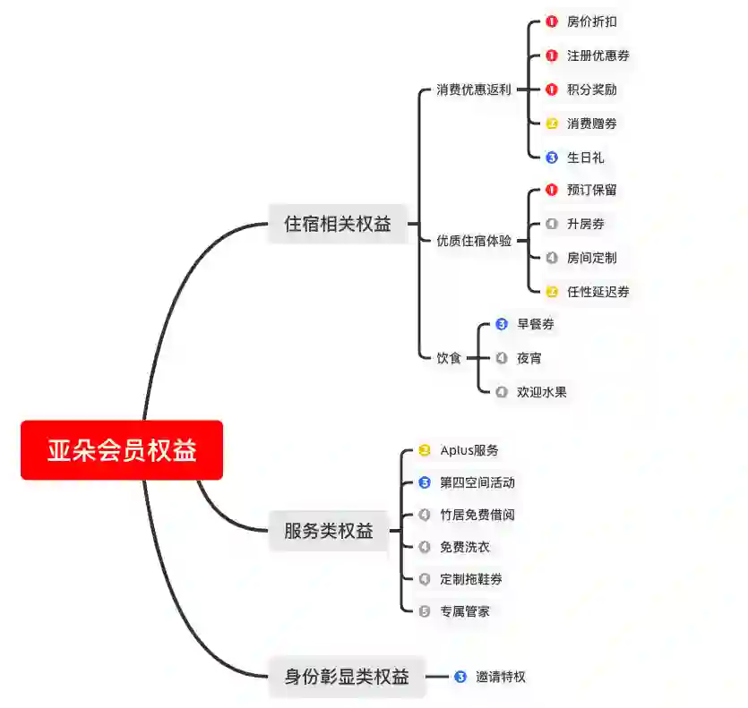 从核心权益角度看:亚朵的会员权益基本围绕住宿需求,其核心权益是消费优惠返利,涵盖1-5级全部会员。可见酒店类产品的用户的核心诉求还是在于更高的性价比。