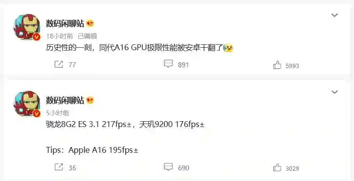 可见,历经多年的性能竞赛,高通的 Adreno GPU、Arm 的公版 GPU 取得了长足的进步。刚好今年 iPhone 14 Pro 系列的 A16 提升幅度较小,安卓手机终于完成逆袭,扬眉吐气了一回。