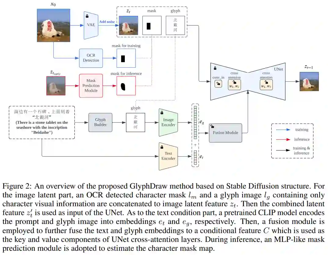GlyphDraw 基于 Stable Diffusion 中的交叉注意力机制,原始输入潜在向量 z_t 被图像潜在向量的 z_t、文本掩码 l_m 和字形图像 l_g 的级联替代。
