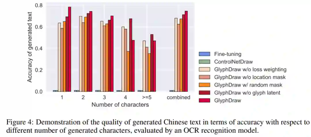 该研究介绍了训练数据集的构建过程,并提出了一个新的基准来使用 OCR 模型评估汉字图像生成质量。其中,GlyphDraw 获得了 75% 的生成准确率,明显优于以前的图像合成方法。