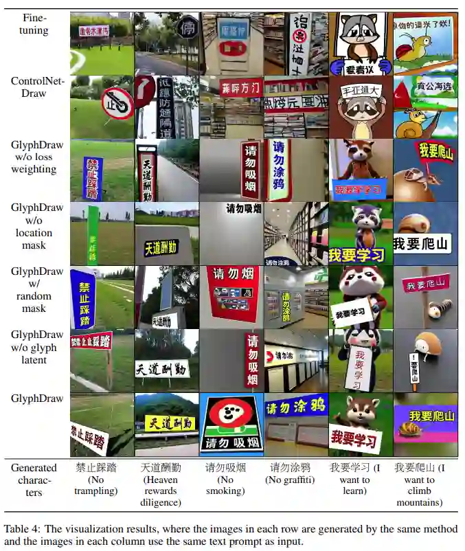 此外,通过使用特定领域的融合模块,条件 C 配备了混合字形和文本特征。文本掩码和字形信息的引入,让整个训练过程实现了细粒度的扩散控制,是提高模型性能的关键组成部分,最终得以生成带有汉字文本的图像。