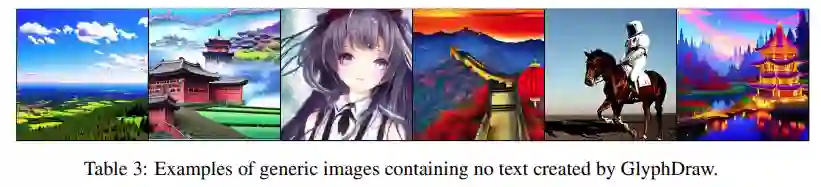 此外,GlyphDraw 还可以通过限制训练参数来保持开放域图像合成性能,在 MS-COCO FID-10k 上一般图像合成的 FID 仅下降了 2.3。