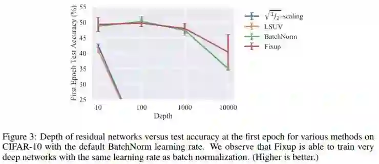 Fixup 使得能够在 CIFAR-10 上以高学习速率训练一个 110 层的深度残差网络,得到的测试集表现和利用批标准化训练的同结构网络效果相当。
