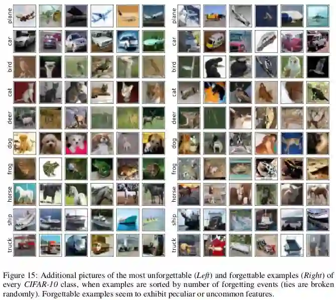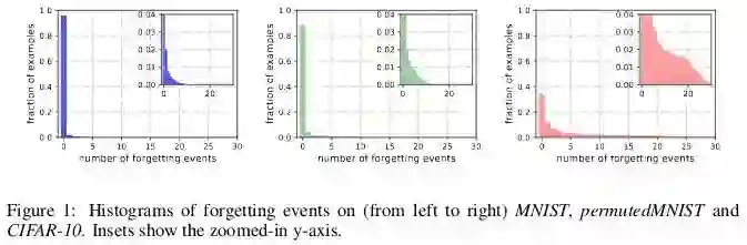 当神经网络在时刻 t 给出准确分类,而在 t+1 时刻发生误分类,此时称为发生遗忘事件。这里的时刻是指网络中 SGD 的更新次数。为了追踪遗忘事件,研究者每次只在 SGD 更新时的小批次数据中的样本上运行神经网络,而不是在数据集的每个样本上运行。对于在训练时不会发生遗忘事件的样本,称之为难忘性样本。