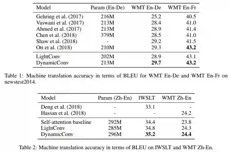 研究者也证明,在机器翻译、语言建模和抽象总结等任务上,这些新卷积能够使用数量相当或更少的参数,达到或超过基于自注意力的基准效果。