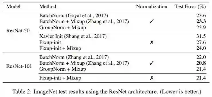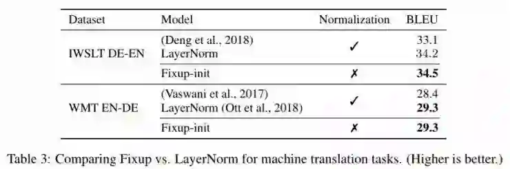 研究者也进一步展示了在没有任何标准化处理下,基于 Fixup 得到的神经网络在 ImageNet 数据集和英语-德语机器翻译任务上与 LayerNorm 网络得分相当。
