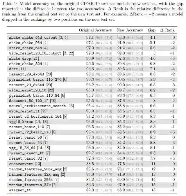 研究者发现,很多神经网络模型在从原来的测试集切换到新测试集的时候,都出现了明显的准确率下降(4% - 15%)。但各模型的相对排名依然相对稳定。