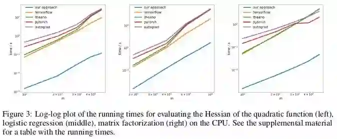 研究者在三个不同的问题上测试了他们进行反向模式自动微分的方法,也就是反向传播,并测试了其计算 Hessian 矩阵所消耗的时间。