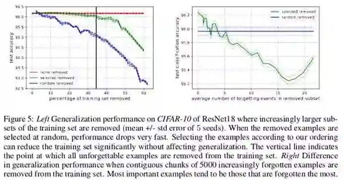 在 CIFAR-10 中,在不影响测试集准确率的情况下,30% 的数据是可以移除的,删除 35% 的数据后准确率会下降 0.2%。如果所移除的 30% 的数据是随机挑选的,不是基于难忘性来选取,准确率将会显著下降 1%。