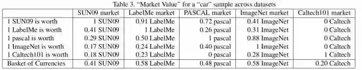 研究者在某数据集训练分类器,并在其他数据集上评估表现效果,进一步度量数据集的价值。根据这个指标,LabelMe 和 ImageNet 是偏差最小的数据集,在「一篮子货币(basket of currencies)」上得分 0.58。所有数据集的得分都小于 1,表明在其他数据集上训练的模型都给出了更低的准确度。在没有数据集偏差的理想情况下,应该有一些得分是高于 1 的。