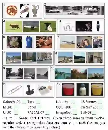 在一篇 2011 年旧论文 Unbiased Look at Dataset Bias 里,研究者根据 12 个流行的图像数据集,尝试通过训练一个分类器用以判断一个给定图像来自于哪个数据集,来探索是否存在数据集偏差。