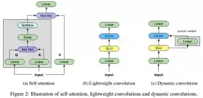 轻量级卷积(lightweight convolutions)是深度可分离(depthwise-separable)的,它在时间维度上进行了 softmax 标准化,通道维度上共享权重,且在每个时间步上重新使用相同权重(类似于 RNN 网络)。动态卷积(dynamic convolutions)则是在每个时间步上使用不同权重的轻量级卷积。