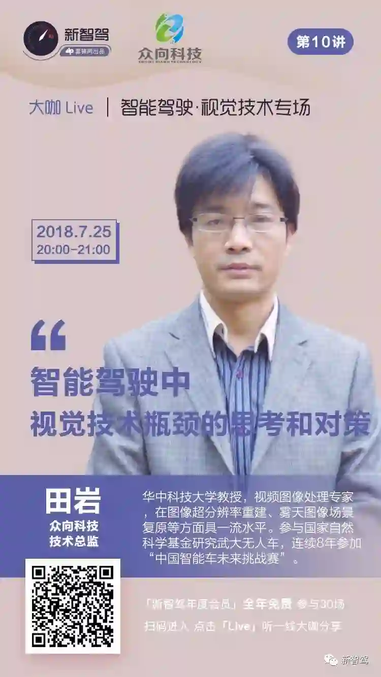 7 月 25 日(星期三)晚上 8 点,【大咖Live】第 10 期视觉感知专场,我们邀请到武汉众向科技技术总监田岩博士,详细解析智能驾驶中的视觉计算问题。照例,本次分享对新智驾年度会员免费开放。