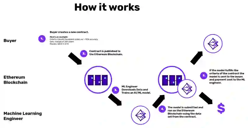 且不论区块链和人工智能行业中存在的泡沫。如果我们能建立一个基于区块链的机器学习市场,那它就结合了两大优势:一是私人化的机器学习,即允许在不透露用户敏感隐私数据的情况下训练模型;二是区块链的激励机制,它会优先选择最佳数据和模型,并使其变得更智能。它们共同作用的结果就是一个开放的市场:任何人都能在里面出售数据,同时保证数据的安全性;而开发者则可以通过激励机制为算法筛选优质数据。