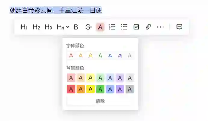 飞书文档则是一款足够好用的实时协作编辑器。除了上文提到的划线评论、表情回复等,它对于格式的限制恰巧体现了产品团队的克制。飞书文档支持基本的对齐方式、删除 / 下划线、粗体斜体外,对于文本的高亮则内置了好看、适合屏幕显示的颜色,让深入处理内容时的高亮操作更加便捷高效。