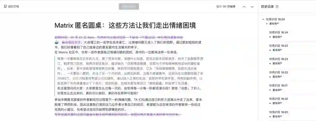 使用飞书进行约稿更是编辑部的日常。编辑 @会飞的三羊店长 经常组织圆桌活动,在这个场景下,飞书精细的权限控制则格外地好用。飞书文档可以将编辑权限打开到「网络上所有获取链接的人都可编辑」,即便将链接给到未注册飞书账户的用户,对方也可以直接编辑,没有注册压力;另外,未注册用户会以「访客」身份登录,这也可以满足「匿名写作」等特殊写作场景的需求。