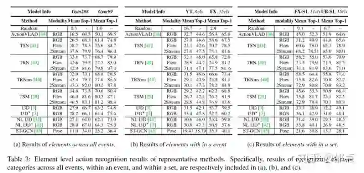 我们将现在主流的几类动作识别方法都在FineGym上进行了测评,具体有: