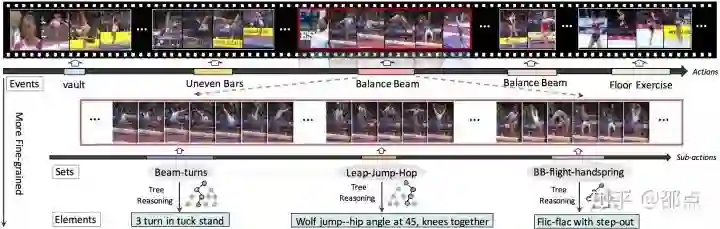 “二”:在时域上,FineGym具有两层的结构,分别为动作和子动作。一个长视频中会出现多个动作,它们的开头和结尾会被标注。同时,一个动作内部会有多个子动作,这些子动作的时域位置会被标注。动作由事件类别来描述,而时域上更细粒度的子动作可以由组类别和元素类别两种粒度进行描述。